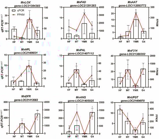 To further validate the accuracy of the transcriptomic data, we selected key biosynthetic genes associated with fatty acid metabolism (MnLOX, MnHPL, MnFAD, MnAAT) and phenylpropanoid metabolism (MnPAL, MnF3′H, MnDFR, MnANS, MnUFGT) in Morus L. for qRT-PCR analysis (Figure 6). Expression analysis revealed that MnLOX (gene-LOC21384383), which catalyzes unsaturated fatty acid oxidation to hydroperoxides, and MnHPL (gene-LOC21406031), responsible for hydroperoxide conversion to volatile compounds, were both significantly upregulated in ‘YMR’ relative to ‘HF’, ‘MT’, and ‘G4’. Lactone biosynthesis genes MnFAD (gene-LOC21391283) and MnAAT (gene-LOC112093772) similarly exhibited elevated expression in ‘YMR’. Conversely, anthocyanin biosynthesis genes MnPAL (gene-LOC21407112), MnF3’H (gene-LOC21388202), MnDFR (gene-LOC21412083), MnANS (gene-LOC21405925), and MnUFGT (gene-LOC21404970) demonstrated significantly higher expression in ‘HF’, ‘MT’, and ‘G4’ compared to ‘YMR’. These findings demonstrate strong concordance between qRT-PCR and transcriptomic data, thereby validating the reliability of the transcriptomic analysis.