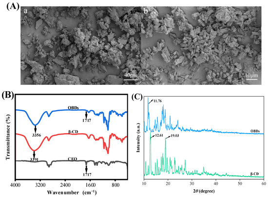 The encapsulation efficiency of OBDs was calculated as 73.78%, following the method of Chen et al. [27]. The SEM images of β-CD and OBDs are presented in Figure 1A. The microstructure of β-CD appeared irregular, with numerous aggregated cuboid-like structures. In contrast, the OBDs exhibited a predominantly rhombohedral morphology with sharp edges and corners, consistent with previous findings reported by Shi et al. [37]. The FTIR spectra of CEO, β-CD and OBDs are presented in Figure 1B. The CEO exhibited a characteristic C=O stretching vibration at 1717 cm−1, corresponding to the carbonyl groups of aldehydes or esters—key chemical constituents of the oil. In the FTIR spectrum of OBDs, a similar carbonyl absorption was observed at 1717 cm−1, while this peak was absent in the spectrum of β-CD, indicating the presence of CEO in the OBDs. The relatively weak intensity of the 1717 cm−1 peak in the OBDs suggests effective encapsulation of CEO within the β-CD matrix, likely due to the shielding effect provided by the β-CD cavity [38]. Additionally, a red shift in the O–H stretching vibration from 3391 cm−1 in β-CD to 3356 cm−1 in OBDs indicated enhanced hydrogen bonding interactions between CEO and β-CD. These interactions contributed to the formation of a more compact and stable microcapsule structure [39]. XRD patterns of β-CD and OBDs are shown in Figure 1C. β-CD exhibited sharp diffraction peaks at 2θ = 12.61° and 19.03°, characteristic of its cage-like crystalline structure. In contrast, OBDs displayed a principal peak at 2θ = 11.76°, along with a broad range of channel-like peaks between 13° and 22°. These changes in peak position, shape, and intensity reflect significant structural rearrangements upon CEO encapsulation, suggesting a transition of β-CD from its native cage-like lattice to a layered arrangement following inclusion complex formation [40]. Collectively, these results confirm the successful preparation of OBDs through the incorporation of CEO into the β-CD matrix.