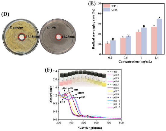(A) SEM images of (a) β-CD and (b) OBDs. (B) FTIR spectrum of CEO, β-CD and OBDs. (C) XRD patterns of β-CD and OBDs. (D) The antibacterial activity of OBDs against S. aureus and E. coli. (E) The antioxidant activity of OBDs. (F) Color changes (inset) and UV-visible spectra of anthocyanin solutions in different pH solutions (pH 1–12). Different letters (a–d, A–D) indicated significant differences within groups (p < 0.05).