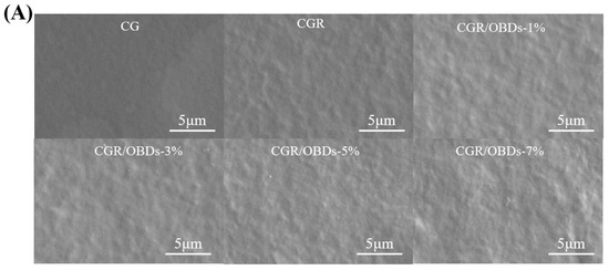 Packaging films with suitable barrier properties are essential for reducing moisture and gas exchange between food and the external environment, thereby preventing spoilage and extending shelf life. The WVP and OP values of CG films with ROSA and varying OBDs concentrations are shown in Figure 3A,B. Incorporation of ROSA significantly reduced both WVP and OP compared with CG, likely due to cross-linking interactions between anthocyanins and the biopolymer matrix that produced a denser structure. Among the CGR/OBDs films, those with 1%, 3%, and 5% OBDs demonstrated further reductions in WVP, while the film containing 7% OBDs showed a notable increase. The presence of OBDs enhanced film thickness and compactness, effectively impeding moisture and gas diffusion. This improvement was attributed to the filling effect of the microcapsules, which reinforced the film matrix and enhanced structural integrity. However, excessive OBDs content disrupted the film network, creating loose pores within the cross-linked matrix. These microstructural defects facilitated oxygen and water vapor transmission, leading to increased WVP and OP values at higher OBDs concentrations [57,58].