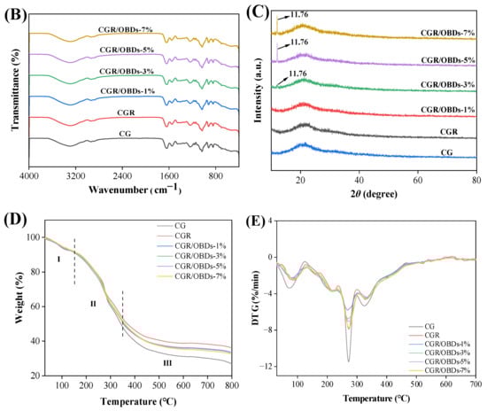 Thermogravimetric analysis was employed to evaluate the thermal stability of the films by monitoring mass loss during controlled heating. As illustrated in Figure 2D, all films exhibited three distinct stages of mass degradation. The first stage, between 30 °C and 150 °C, corresponded to the evaporation of adsorbed moisture, crystal water, and residual solvents. The second stage, from 150 °C to 350 °C, involved substantial weight loss caused by volatilization of residual glycerol and thermal decomposition of GEL, CAR, anthocyanins, and β-CD. Degradation of β-CD was accompanied by the release of citronella essential oil [50]. The maximum weight loss rate (Tmax) occurred near 271 °C, corresponding to the breakdown of the gelatin protein chains and the disruption of the polysaccharide structure in CAR [51]. The third stage of decomposition, spanning 350 °C to 800 °C, reflected further degradation, fracture, and potential carbonization of the film matrix [52]. Residual weights at 800 °C were 26.83% for CG and 36.27% for CGR films. For CGR/OBDs films, the residual masses were 30.72%, 33.25%, 33.50%, and 32.70% at OBDs concentrations of 1%, 3%, 5%, and 7%, respectively. In the DTG curve, the Tmax of CGR and CGR/OBDs values for the initial and third stages in CGR and CGR/OBDs films shifted to higher temperatures compared to the CG film, while the peak intensities of Tmax in all three stages decreased significantly. These results suggest that the addition of ROSA improved the thermal stability of the CG matrix, likely due to the formation of cross-links between anthocyanins and the biopolymer components, resulting in a denser film structure. Incorporation of OBDs increased the total decomposition mass relative to CGR, likely due to essential oil dispersion, while reducing the overall decomposition rate, indicating a stabilizing effect of OBDs on the film matrix. A similar enhancement in thermal stability following essential oil microencapsulation was reported by Akrami et al. [53]. In contrast, other studies have shown that the inclusion of anthocyanins from black wolfberry and bayberry pomace slightly reduced the thermal stability of pullulan/PVA-based films [54,55].