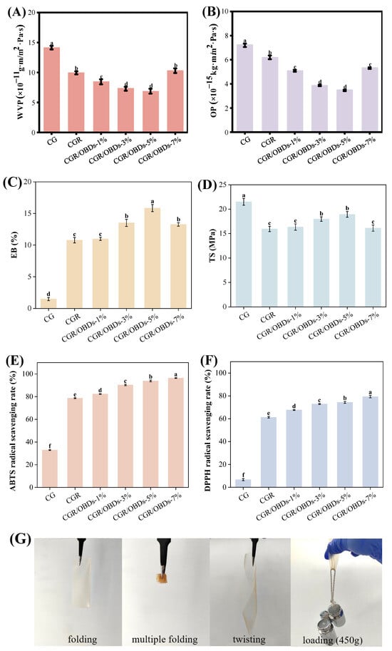 Barrier properties (A) WVP and (B) OP. Mechanical properties (C) EB and (D) TS. And antioxidant capacities (E) ABTS and (F) DPPH radical scavenging rates of various composite films. (G) Photographs of CGR/OBDs-5% composite film under folding, multiple folding, twisting and loading with 450 g. Different lowercase letters (a–f) indicated significant differences within groups (p < 0.05).