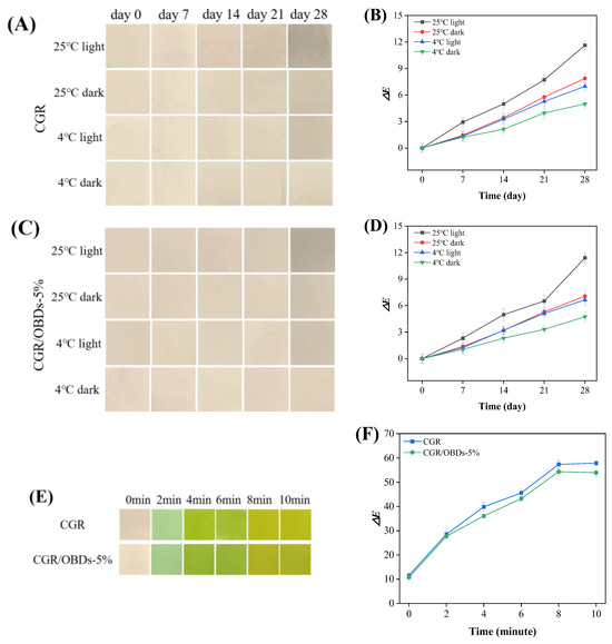 Color stability evaluation of films under different storage conditions: (A) The photographs taken over a 28-day period and (B) the corresponding changes in the ΔE value of the CGR film. (C) The 28-day photographs and (D) the changes in the ΔE value of the CGR/OBDs-5% film. Determination of ammonia sensitivity of various composite films: (E) photographs of films’ color changes and (F) the changes in the ΔE value.