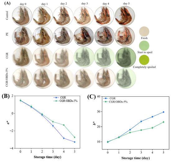 Fresh shrimp were obtained from a local market in Kunming, China, and stored at 4 °C for five days to investigate the films’ colorimetric indication of freshness. Shrimp samples of similar weight (20 ± 2 g) were placed in Petri dishes (13 cm in diameter and 2.5 cm in height) and assigned to four packaging conditions: unwrapped, wrapped with polyethylene (PE) cling film, covered with CGR film, and covered with CGR/OBDs-5% film (film dimensions: 20 cm × 20 cm). During storage, shrimp quality was assessed at predetermined intervals. Measured parameters included pH, total volatile base nitrogen (TVB-N, mg/100 g), total viable count (TVC, log CFU/g), and the a*, b*, and ΔE values of the films. pH was measured according to the GB 5009.237-2016 standard. TVB-N was determined by the semi-micro Kjeldahl method in accordance with GB/T 5009.44-2003, and TVC was assessed following the GB 4789.2-2022 protocol.