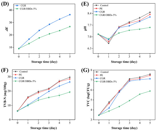 To assess the practical performance of the smart packaging material, the CGR/OBDs-5% composite film, identified as the optimal formulation, was applied for shrimp preservation at 4 °C. Three key indicators were monitored to assess shrimp spoilage: pH, TVB-N, and TVC, along with the color difference (ΔE) of the smart packaging films. As illustrated in Figure 6A, on day 0, all shrimp samples across the four packaging groups appeared fresh, with translucent shells, gray coloration, and a plump, glossy texture. By day 2, shrimp in both the control and PE groups displayed early spoilage signs, including distinct red and black spots, indicating that air exposure or conventional plastic packaging could not effectively prevent deterioration. By day 3, these defects became more pronounced in the control and PE groups. Although shrimp in the CGR group showed slightly better quality, visible spoilage was still evident, accompanied by a film color shift from yellow to light green, suggesting limited antimicrobial protection. In contrast, shrimp packaged with CGR/OBDs-5% retained a fresh appearance, exhibiting intact color and plump morphology with minimal visible spoilage. These findings demonstrate that OBDs incorporation enhanced the antimicrobial and freshness-preserving performance of the films. By day 5, severe spoilage was observed in the control and PE groups, with shrimp surfaces covered by extensive black spots. In the CGR group, the film turned dark green and deterioration became more apparent. Notably, shrimp packaged with CGR/OBDs-5% still retained relatively normal color and morphology, with only mild quality decline. Spoilage indicators such as surface blackening and turbidity were substantially less pronounced compared with other groups. These results provide strong evidence that the CGR/OBDs-5% film effectively extends shrimp shelf life and maintains freshness during refrigerated storage.