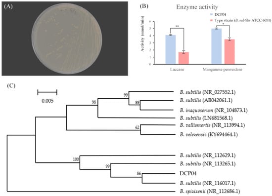Isolation, identification, and enzymatic characterization of B. subtilis DCP04. (A) A clear halo zone formed by strain DCP04 on BSAM containing 0.1% LDPE powder. (B) A neighbor-joining phylogenetic tree based on 16S rRNA gene sequences, showing the relationship between strain DCP04 and reference B. subtilis strains. (C) Laccase and MnP activities of strain DCP04 compared to the type strain (B. subtilis ATCC 6051). Data are presented as mean ± SD from three independent experiments (n = 3). An asterisk (*) denotes a significant difference (p < 0.05), and double asterisks (**) denote a highly significant difference (p < 0.01) when compared to the type strain.