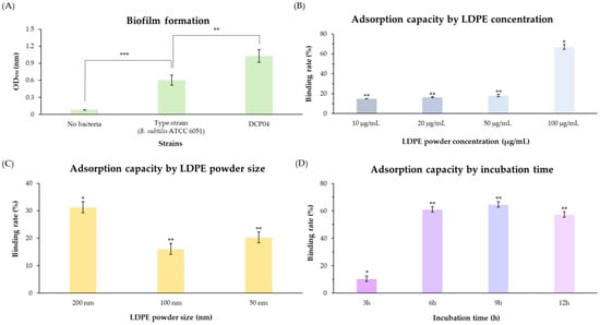 Biofilm formation and quantitative analysis of LDPE nanoparticle adsorption. (A) Quantification of biofilm formation by B. subtilis DCP04 strain. (B–D) NTA-based quantification of LDPE nanoparticle adsorption efficiency, showing the effects of (B) particle concentration, (C) particle size, and (D) incubation time. All quantitative data are presented as mean ± SD from three independent experiments (n = 3). An asterisk (*) denotes a significant difference (p < 0.05), double asterisks (**) denote a highly significant difference (p < 0.01), and triple asterisks (***) denote a significant difference (p < 0.001) when compared to the type strain.