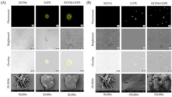 Representative micrographs visualizing the interaction between B. subtilis DCP04 and LDPE particles. (A) CLSM and FE-SEM images showing extensive colonization of bacterial cells on a micro-sized (25 μm) LDPE particle. (B) CLSM and FE-SEM images showing the adhesion of nano-sized (200 nm) LDPE particles to bacterial cells. Scale bars are included in each micrograph.
