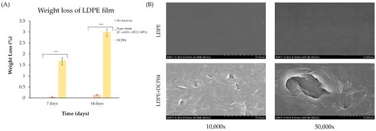 The biodegradative capability of the DCP04 strain was first quantified by measuring the weight loss of LDPE films after a 14-day incubation period. A significant difference in weight loss was observed among the experimental groups (Figure 4A). Films incubated with B. subtilis DCP04 exhibited a substantial weight reduction of 2.92 ± 0.27%. In contrast, films incubated with the type strain (B. subtilis ATCC 6051) or in the bacteria-free control medium showed negligible weight loss (0.20 ± 0.03% and 0%, respectively). These findings indicate that, under the tested conditions, B. subtilis DCP04 possesses a unique capability to degrade LDPE films.
