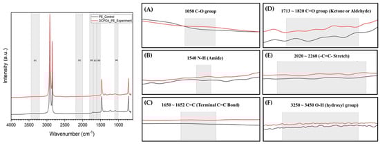 FT-IR analysis of chemical modifications on LDPE films. The spectra compare an untreated control film with a film after 14-day incubation with B. subtilis DCP04. Key spectral regions showing chemical alterations are highlighted: (A) C–O stretching, (B) Amide, (C) alkenes, (D) C=O stretching (carbonyl), (E) C≡C stretching region, and (F) O–H stretching (hydroxyl). The appearance of these functional groups indicates significant oxidative alteration of the polymer surface.