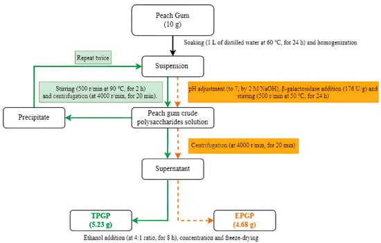 A suspension was prepared by adding 10 g of PG to 1 L of distilled water, soaking the mixture at 60 °C for 24 h, and homogenizing it with a blender. The pH was adjusted to 7, followed by the addition of β-galactosidase at 176 U/g. The mixture was stirred at 50 °C and 500 rpm for 24 h and centrifuged at 4000 rpm for 20 min to collect the supernatant. After centrifugation, the pellet was discarded, and only the supernatant was further processed for ethanol precipitation. The supernatant was concentrated to 20% of the original volume, and then absolute ethanol was added at a 4:1 ratio (v/v) and left to stand for 8 h. The solution was freeze-dried to obtain EPGP (Figure 1). And The extraction yield of PGPs was determined using the below equation: