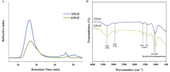 HPSEC profile (A) and FT-IR spectroscopy (B) of TPGP and EPGP.