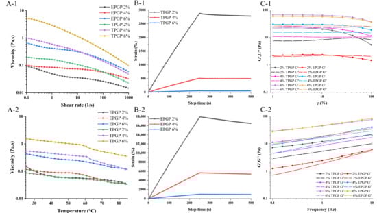 Steady shear tests of PGP solutions: Shear rate range of 0.1 to 1000 s−1 at 25 °C at different concentrations and treatments (A-1), under the heating process, the temperature was increased from 25 °C to 85 °C at a rate of 5 °C/min, with a shear rate of 10 s−1 (A-2); The effect of TPGP and EPGP concentrations on the creep and recovery behavior at 25 °C (B-1,B-2); Dynamic rheological tests: the effects of PGPs under different concentrations and treatments on G′ and G′′ as a function of strain, 1–100%, 25 °C, 1 Hz (C-1); the effects of PGPs concentrations on G′ and G′′ as a function of frequency, 0.1–10 Hz, 25 °C, the strain of 10% (C-2).