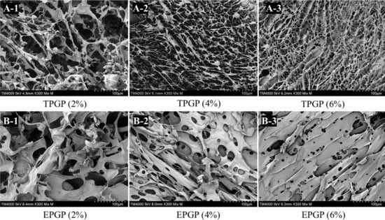 The microstructure of TPGP (A-1–A-3) and EPGP (B-1–B-3) gel with different concentration under different concentrations by SEM.