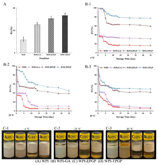 The stability of emulsions was evaluated using centrifugation stability and storage temperature stability tests. Centrifugation is commonly employed as an accelerated stability test to trigger dispersion or aging in emulsions rapidly [35]. WPI-GA, WPI-EPGP, and WPI-TPGP demonstrated higher ES values (25.22%, 30.63%, and 33.34%) compared to WPI (11.55%) (Figure 6A). Both TPGP and EPGP at 3% (w/w) markedly increased the ES of the peach gum-protein complexes (p < 0.05). Among these, WPI-TPGP showed the highest ES, which is likely due to the viscosity of the emulsion solution [10]. The viscosity of WPI-TPGP (3% w/w) is higher than that of WPI-EPGP (3% w/w), and the viscosity was directly correlated with molecular weight (Table 1). The interaction between WPI and TPGP resulted in a higher viscosity of PGPs in the emulsion, which improved the ES of WPI.
