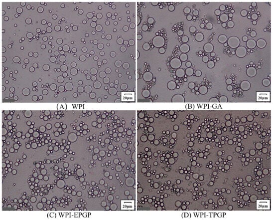 Previous studies on tree gum have fully demonstrated that gum polysaccharides exhibit relatively good emulsifying properties, serving as both emulsifiers and stabilizers [36,37,38]. The mechanism primarily involves increasing viscosity and stabilizing oil droplets by adsorbing onto their surfaces, thereby preventing coalescence and ensuring stable dispersion within the emulsion [39]. The prepared emulsions were observed using a BX53 microscope (Olympus, Tokyo, Japan) (Figure 7). Emulsions without GA and PGPs exhibited dispersed oil droplet distribution with irregular morphology. After the addition of GA, the oil droplets became uniform in shape but larger in size. In contrast, the addition of PGPs resulted in oil droplets with more consistent size and distribution without noticeable aggregation. Furthermore, emulsions containing TPGP featured smaller droplet sizes. It has shown that higher stability is generally observed in emulsions with smaller droplets, as smaller droplets both adsorb more polysaccharide molecules on their surface and prevent aggregation and sedimentation effectively [40]. WPI droplets can be coated with a secondary protective layer formed by polysaccharides [41]. Consequently, emulsions containing TPGP and EPGP demonstrated higher viscosity and a more compact fibrillar structure, significantly enhancing the emulsion stability of WPI. The molecular weight of PGPs was positively correlated with the ability to improve oil-water emulsion stability. The viscosity and stability of the emulsion increase with the molecular weight of PGPs, which was consistent with the conclusion of Wei et al. [10]. The functional groups anchored at the oil-water interface and the long molecular chains extending away from the interface are fundamental characteristics of emulsifying stabilizers. PGPs can still function effectively as stabilizers even with low hydrophobic group content, provided the potential anchoring sites are readily accessible and able to bind firmly, facilitating polymer attachment as highly branched polymers [42]. Furthermore, the presence of charged -COOH groups in PGPs enabled electrostatic interactions, which contribute to emulsion stability, particularly under low ionic strength conditions [43]. The highly branched macromolecular structure was likely the main reason for the better emulsifying properties of PGPs, while the spherical morphology of macromolecules effectively enhanced the stability of emulsions at the oil-water interface.