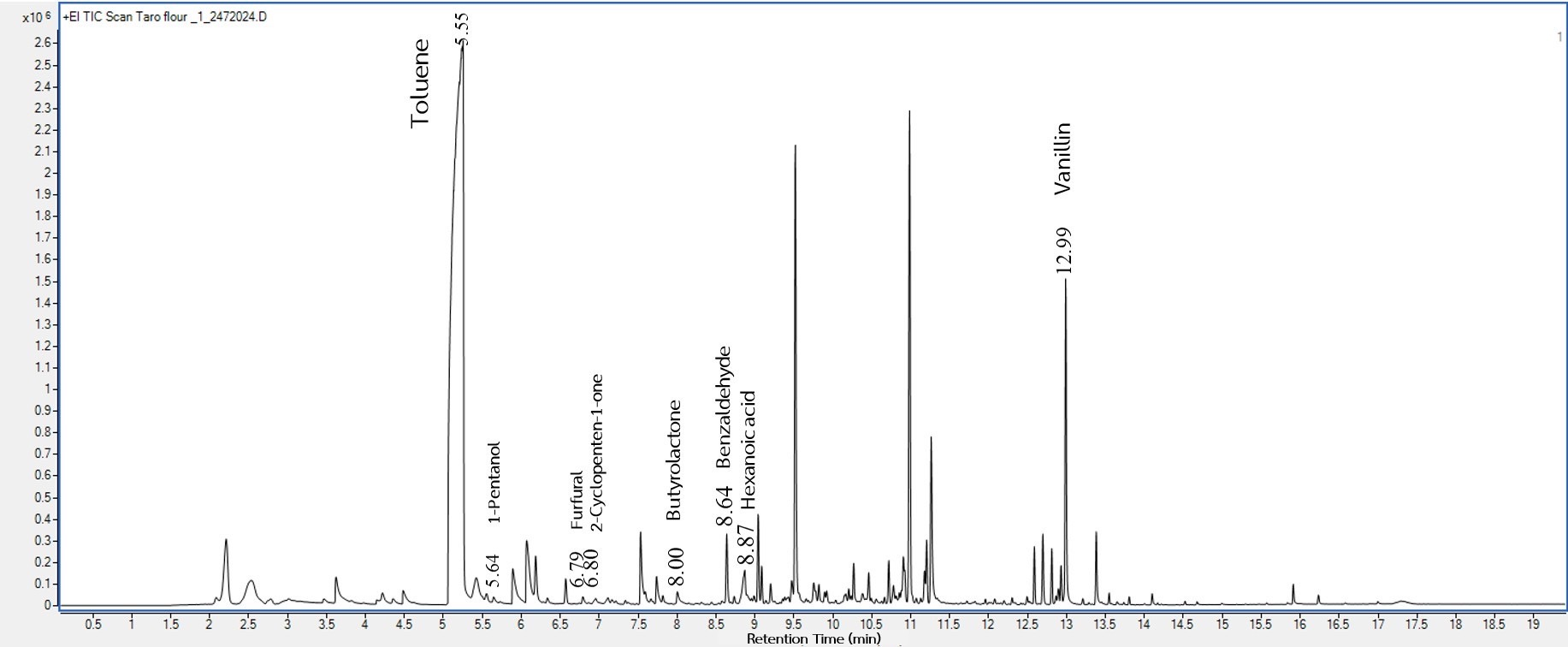 1-Pentanol | 5.64 | 5.3 × 104 | 5.1 × 104 | 5.7 × 104 | 7.3 × 104 | Taro, Sweet | [22] |