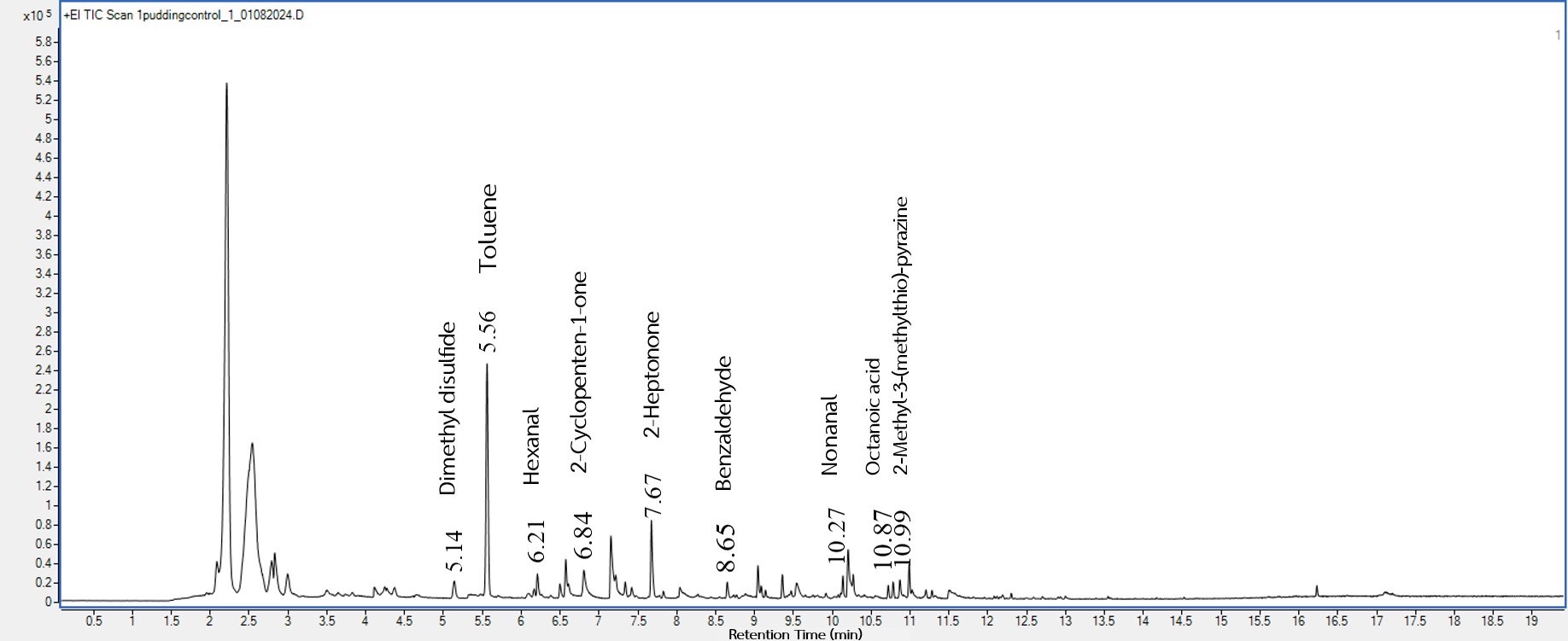 Benzaldehyde | 8.64 | 3.7 × 105 | 5.4 × 105 | 7.5 × 105 | 1.4 × 106 | Almond, Nutty | [23] |