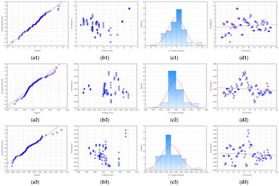 Prior to the optimization step, it is crucial to evaluate the adequacy of the developed RSM models [64]. Therefore, residual analysis was used (Figure 4). A residual is the difference between an observed, experimental value and the value predicted by the model. By analyzing these residuals, researchers can assess whether the assumptions of the model are being met. All models showed that the residuals were normally distributed, an essential assumption confirmed in two ways: first, the residuals were closely aligned along a straight line in normal probability plots (Figure 4), and second, the histograms (Figure 4) of the residual distribution exhibited a classic bell-shaped curve with minimal skewness. Furthermore, the analysis confirmed that the residuals were randomly distributed (Figure 4), which is crucial for a robust model. Plots of residuals against the predicted values showed no discernible patterns (Figure 4), indicating that the models accurately captured the relationships between the variables and that no systematic bias was present. A plot of residuals versus the experimental run order (Figure 4) confirmed that the randomization of the experiments was successful and that the sequence of tests did not influence the results. According to Salehi et al. [65], this implies that the level of randomization was adequate and that the order of testing did not influence the data. Overall, the residual analysis confirmed that the developed RSM models are statistically sound, with no evidence of model inadequacy or non-random errors, ensuring the reliability of the optimization results.