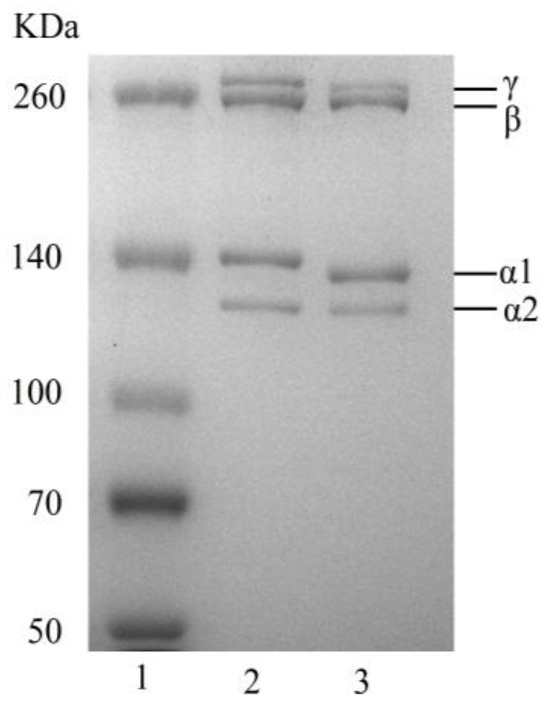 Electrophoretogram. (1) Protein Marker; (2) Rat tail type I collagen; (3) BBC.