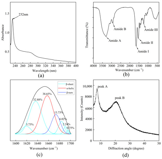 Structure of BBC. (a) Ultraviolet absorption spectrum; (b) FTIR spectrum; (c) Secondary structure fitting diagram. The black line refers to the FTIR spectrum in the 1600–1700 cm−1 range; (d) X-ray diffraction spectrum.