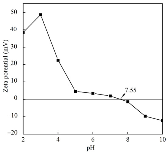 At pH 7.55, BBC exhibited an almost zero net surface charge (Figure 3), which is recognised as the isoelectric point (pI) of the collagen [17]. In the pH range of 2–7.55, the BBC was positively charged due to the dissociation of carboxylic acid or acidic side groups through their interaction with H+. In the pH range of 7.55–10, the BBC was negatively charged due to the dissociation of the amino or basic side groups through their interaction with OH− [38]. The pI of BBC (7.55) was higher than that of others reported for other aquatic collagen sources, including grass carp swim bladder (6.59) [11], yellowfin tuna swim bladder (6.05) [17], and seabass swim bladder (6.64) [33]. The higher pI of the BBC was related to the amino acid sequence and amino acid residue distribution [37].