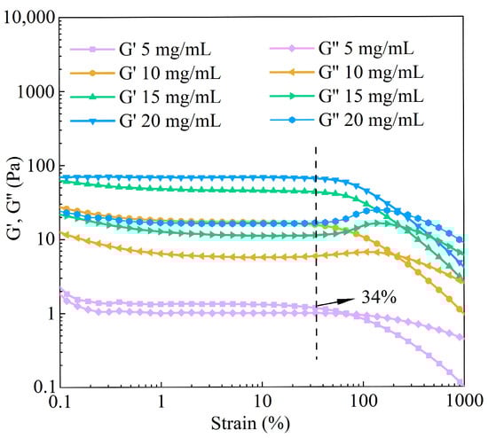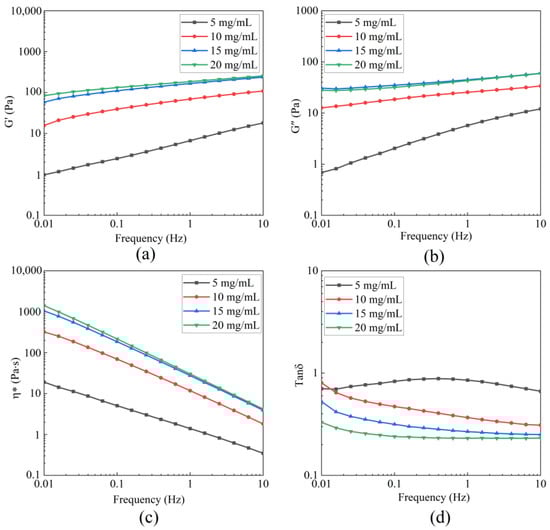 The LVR of BBC solutions with different concentrations was determined through strain sweep tests (Figure 5). The critical strain was 34%. Below the critical strain, storage modulus (G′) and loss modulus (G″) remained stable. When the strain exceeded the LVR, the values of G′ and G″ for collagen solutions of various concentrations were unstable and decreased, which indicated that the strain disrupted the entangled network structure of collagen [44]. The dynamic rheological results are shown in Figure 6. Under the condition of constant frequency, as the concentration of the BBC solution increased, its G′, G″, and η* all consistently increased. This result revealed concentration as an important factor regulating the rheological behaviour and viscoelastic characteristics of the BBC solution. When the frequency was fixed at 0.01 Hz, during the process of increasing the concentration from 5 mg/mL to 20 mg/mL, the value of G′ significantly increased from 0.979 Pa to 84.2 Pa. The value of G″ increased from 0.689 Pa to 27.8 Pa, and the η* increased from 19.1 Pa·s to 1410 Pa·s. The changes in G′ were more pronounced than those in G″, indicating that the enhancing effect of increased concentration on the elasticity of the BBC solution was pronounced than its effect on the viscosity. The entangled network of BBC relied on the characteristic (Gly-X-Y)n repeating sequence, where glycine enhanced the compactness of the chains, while proline and hydroxyproline formed hydrogen bonds through their pyrrolidine rings [45]. As the BBC solution concentration increased, the entangled network structure became denser, enabling it to store more energy, thereby increasing the G′. Additionally, as the friction between molecular chains increased, the solution required greater resistance to flow, which consequently enhanced the η* [7,46,47].