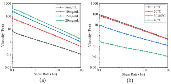 The experiment was conducted following the procedure description in Section 2.6.1. The shear rate was set from 0.1 to 100 s−1. The fitting of viscosity-shear rate curves was performed using the Ostwald–de Waele Model.