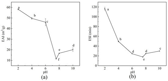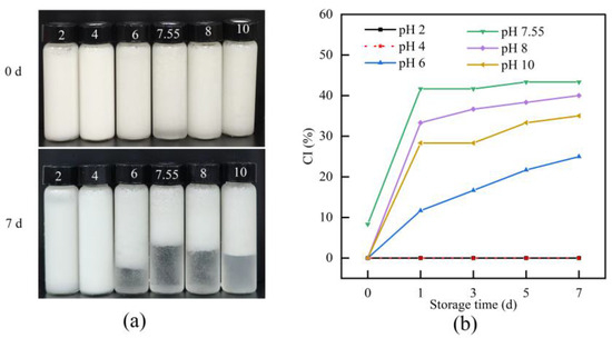 Figure 11 presents the stability changes in BBC emulsions prepared under different pH conditions after 0 and 7 days of storage. Under acidic conditions (pH 2 and 4), the emulsions remained stable throughout the storage period, with no visible phase separation observed. In contrast, when the pH was within the range of 6–10, all emulsions exhibited severe phase separation, which was evident in the formation of a transparent serum layer at the bottom of the system. Notably, the phase separation was most prominent at a pH of 7.55. The CI value of the emulsion at a pH of 7.55 significantly increased from 8.33% to 43.33%, which was higher than that of emulsions prepared at other pH levels. This result showed that at a pH of 7.55, the changes in the charge amount of the system affected the BBC emulsion, significantly weakening intermolecular forces. Thus, massive aggregation of emulsion droplets were observed, ultimately resulting in poor storage stability of the emulsion [21]. These findings are consistent with the conclusions from particle size analysis, further confirming that BBC emulsions possessed excellent storage stability under acidic conditions.