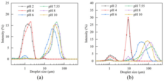 Particle size distribution of BBC emulsions under different pH conditions. (a) Particle size distribution on day 0. (b) Particle size distribution after 7 days of storage.