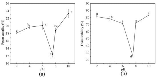 Functional properties of BBC. (a) Foam capacity; (b) Foam stability. The labeling of different letters (a–d) indicates that there are statistically significant differences among the samples.