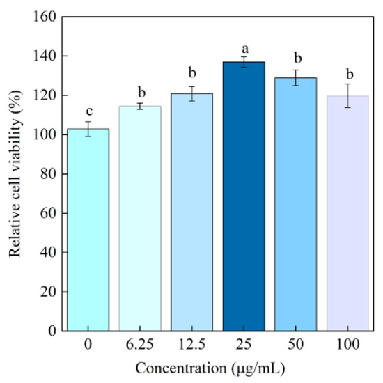 Cell relative proliferation rate after adding different concentrations of BBC for cultivation. The labeling of different letters (a–c) indicates that there are statistically significant differences among the samples.