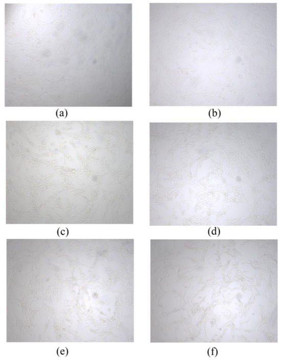 MC3T3-E1 cells morphology after adding different concentrations of BBC for cultivation. (a) 0 μg/mL; (b) 6.25 μg/mL; (c) 12.5 μg/mL; (d) 25 μg/mL; (e) 50 μg/mL; (f) 100 μg/mL.