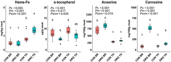 Effect of production system (s), meat type (m), and their interaction term (s × m) on heme-Fe, α-tocopherol, carnosine and anserine in conventional breast (CON BR), organic breast (ORG BR), conventional thigh (CON TH) and organic thigh (ORG TH) in Experiment 1 (n = 10 each). Means with different superscripts are significantly different. p-values for the main effects of production system (Ps), meat type (Pm), and their interaction (Ps × m) were derived from an ANOVA model.