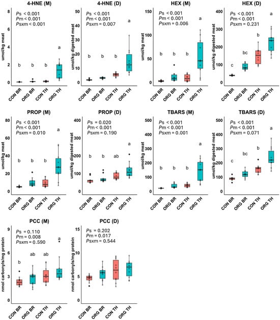 Effect of production system (s), meat type (m), and their interaction term (s × m) on products of lipid oxidation (4-hydroxy-2-nonenal, 4-HNE; hexanal, HEX; propanal, PROP; thiobarbituric acid reactive substances, TBARS) and protein oxidation (protein carbonyl compounds, PCC) in meats (M) and digests (D) of conventional breast (CON BR), organic breast (ORG BR), conventional thigh (CON TH) and organic thigh (ORG TH) in Experiment 1 (n = 10 each). Means with different superscripts are significantly different. p-values for the main effects of production system (Ps), meat type (Pm), and their interaction (Ps × m) were derived from an ANOVA model.