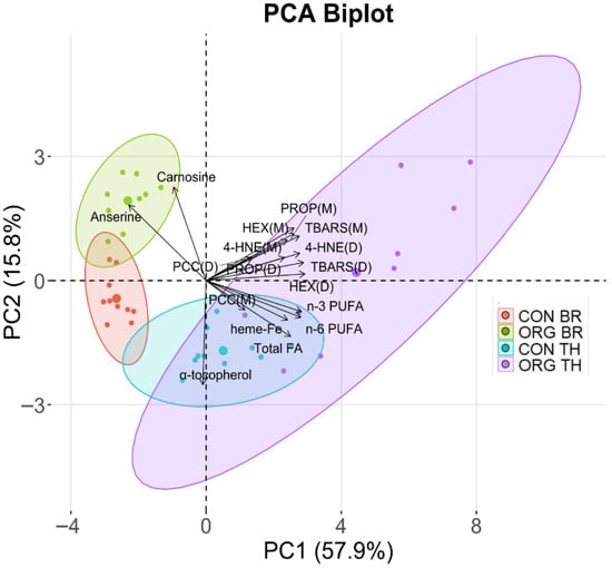 Principal component analysis (PCA) biplot from Experiment 1, showing the distribution of oxidation products (4-hydroxy-2-nonenal, 4-HNE; hexanal, HEX; propanal, PROP; thiobarbituric acid reactive substances, TBARS; protein carbonyl compounds, PCC) in meats (M) and digests (D), as well as meat composition variables (n-6 PUFA, n-3 PUFA, total FA, heme-Fe, α-tocopherol, anserine, carnosine) across experimental groups: conventional breast (CON BR), conventional thigh (CON TH), organic breast (ORG BR) and organic thigh (ORG TH). The ellipse around each group represents the 95% confidence interval, highlighting the separation between groups. The percentage of variance explained by each principal component (PC1 and PC2) is indicated in parentheses.