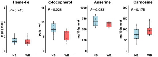 Effect of Normal Breast (NB; n = 10) and Wooden Breast (WB; n = 10) phenotype on heme-Fe, α-tocopherol, carnosine and anserine in meats in Experiment 2. p-values were based on t-test.