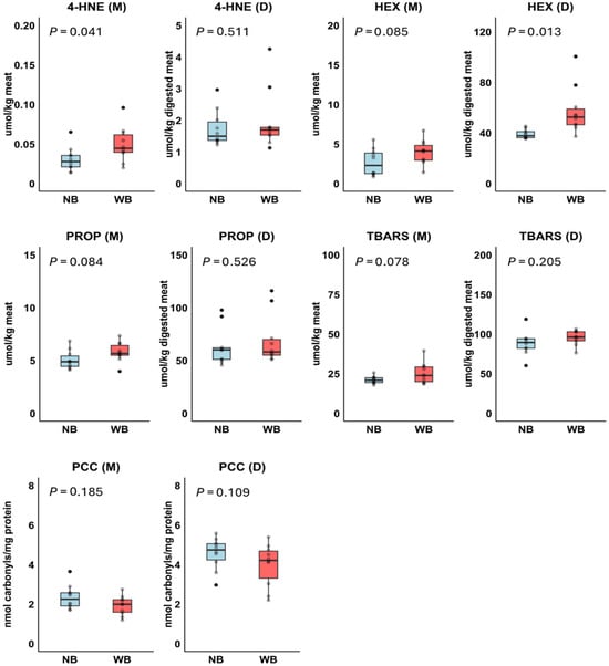 Effect of Normal Breast (NB; n = 10) and Wooden Breast (WB; n = 10) phenotype on products of lipid oxidation (4-hydroxy-2-nonenal, 4-HNE; hexanal, HEX; propanal, PROP, thiobarbituric acid reactive substances, TBARS) and protein oxidation (protein carbonyl compounds, PCC) in meats (M) and digests (D) in Experiment 2. p-values were based on t-test.