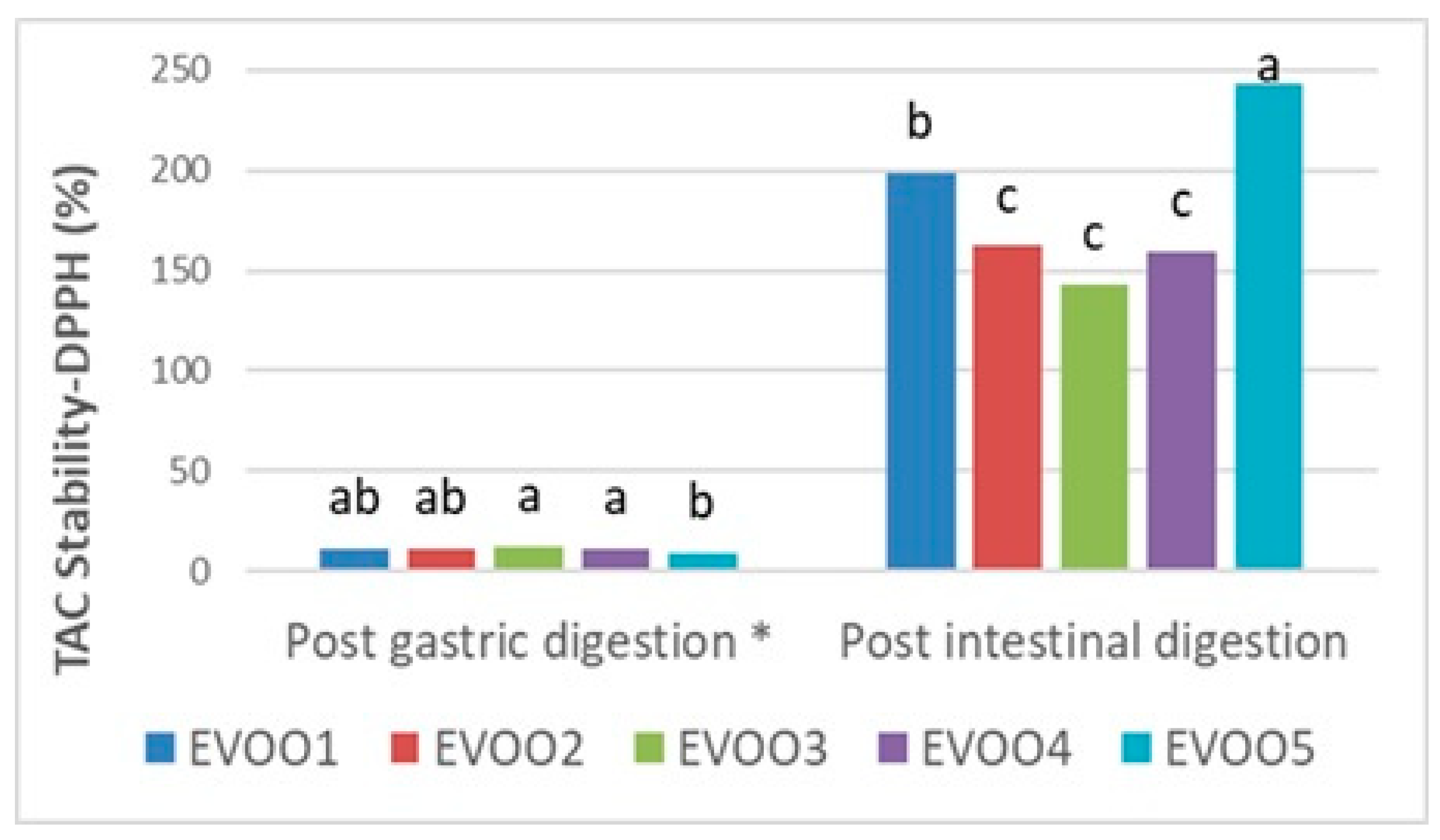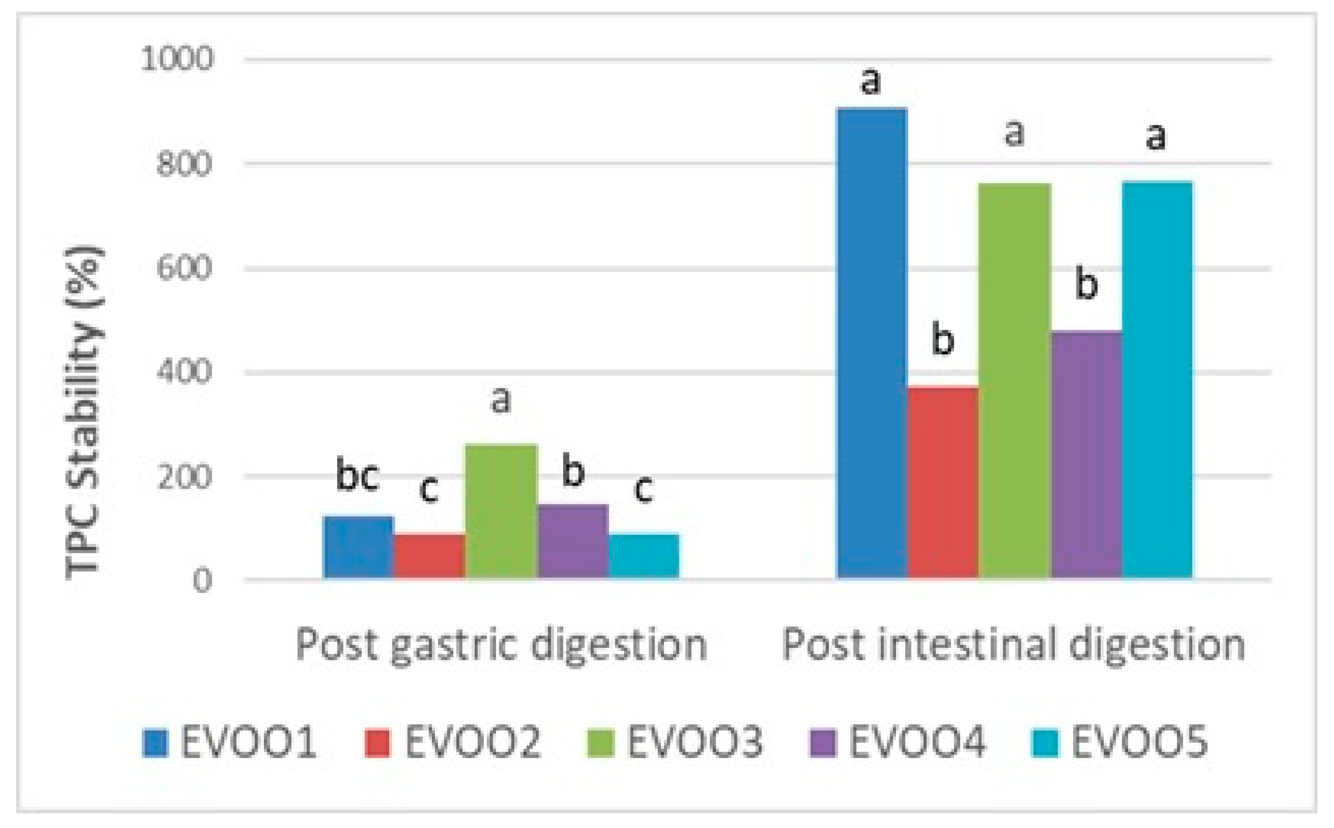 In this context, the issue of analyzing bioaccessible compounds found in EVOO emerges as a very current issue. Additionally, there are no studies assessing the differences in bioactives between trademarked and locally sold EVOO samples and their changes during in vitro gastro-intestinal digestion stages.