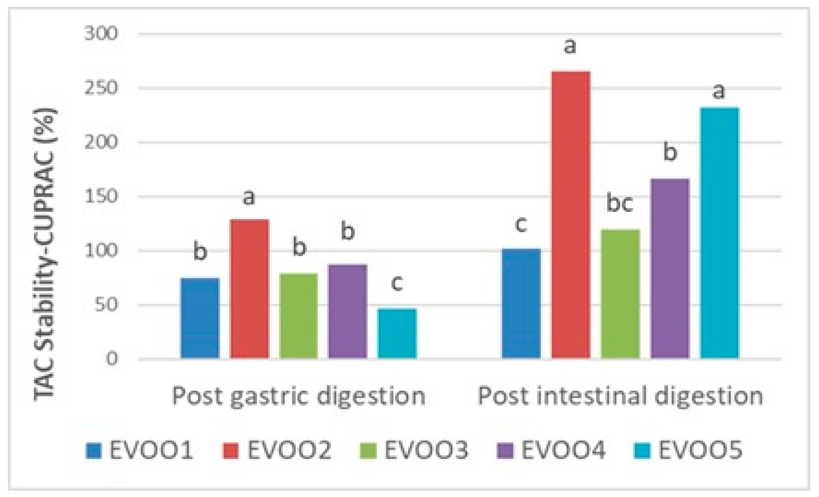 Herein, it was also expected to support the idea that locally produced foods may have higher bioactive potential and a healthier composition than those sold commercially, which could encourage local production. Consequently, bioactive and bioaccessible results of EVOO revealed that local samples exerted higher results when compared with the trademarked one with regard to antioxidative characteristics (TPC, DPPH, and CUPRAC analysis) in undigested, gastrically digested, and intestinally digested phenolics.