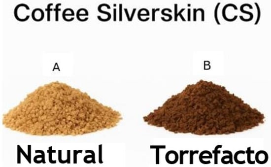 Coffee is currently produced in more than 50 countries, with over three billion cups consumed daily, generating annual revenues exceeding 200 billion USD [1]. During the processing of coffee to obtain roasted beans, approximately 90% of the harvested product—the coffee cherry—is lost, which generates by-products that can negatively impact the environment if not properly managed [1]. Among these by-products is coffee silverskin (CS), which accounts for approximately 5–6% of the green bean’s weight and is the only solid residue produced during roasting process. Globally, coffee roasting generates approximately 200,000 tons of CS per year as a by-product [2]. CS is available in two forms: natural (Figure 1A), obtained when no sugar is added during roasting, and torrefacto (Figure 1B), a traditional roasting method used mainly in some Latin American and Southern European countries, where sugar (typically 10–20%) is added during the final stage of roasting. This induces caramelization and a shiny coating on the beans, promoting the formation of Maillard-derived compounds and altering the silverskin composition [3,4].