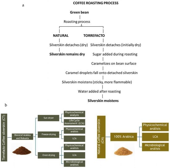 Coffee silverskin was provided by Nestlé (Uruguay). In natural roasting, it detaches early and remains dry, whereas in torrefacto roasting sugar is added after detachment, forming caramel on the bean and releasing droplets that moisten the silverskin, increasing stickiness and flammability. To reduce this risk, water is applied before collection (Figure 2a). Two types of silverskin were obtained: torrefacto (CT, a Brazilian Arabica–Robusta blend with ~55–60% Robusta) and non-torrefacto (CN, exclusively Arabica from diverse origins: Brazil, Colombia, Costa Rica, Sumatra, Peru, and Guatemala) (Figure 2b). Torrefacto blends typically combine Arabica and Robusta, reflecting both historical and technological drivers, as sugar roasting was initially used to mask negative attributes in Robusta and remains mostly marketed as blends rather than single origins [29,30]. Consequently, differences between CN and CT silverskin reflect both origin and roasting, and cannot be attributed to a single factor. Because water is added during glazing for safety, CT required drying pretreatment.