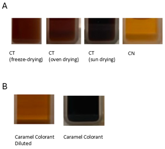 Table 5 shows that the torrefacto silverskins have a similar extract yield, while the natural silverskin has a higher yield. As color evaluation suggests (L*, a*, b*, hue, chroma) of the extracts at a concentration of 7 mg/mL (Table 5 and Figure 3), all solutions could serve as potential caramel-like colorants due to the Maillard and caramelization reactions that occur during the roasting process. There are, however, differences among them: the extract from CT (sun) resulted in a darker solution (lower L*) with less color contribution (lower a* and b*), and high absorbance at 420 nm. In particular, the CT (freeze-dried) and CT (oven-dried) appeared very similar in color characteristics (L*, a*, b*, chroma, hue angle). Further, CN produced the lightest solutions (higher L*), but with greater contributions to a*, b*, chromaticity, and hue angle. Regarding coloring capacity, when compared to a caramel colorant, the silverskin with the highest coloring power per gram was the sun-dried silverskin, which could be attributed to oxidation and polymerization of phenolic compounds (which show lower antioxidant activity—see Table 3) due to the higher drying temperature (79.1 °C).
