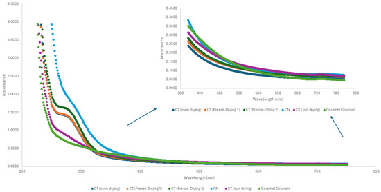 Figure 4 shows the UV-visible spectra of the extracts. These exhibit a maximum absorbance near 330 nm, which may be attributed to chlorogenic acid as well as melanoidins [1,35]. In the near-visible UV region and in the visible region, the extracts display similar spectra among themselves and to the caramel colorant.