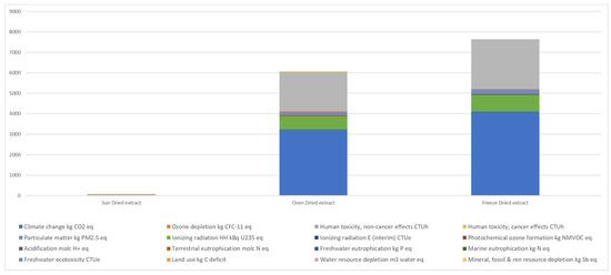 The environmental impact of the three drying processes was assessed using Life Cycle Assessment (LCA) with the SimaPro 8 software (Pré Consultants B.V, Amersfoort, The Netherlands). The International Reference Life Cycle Data System (ILCD) method was selected for impact calculation, following the ILCD 2011 Midpoint+ approach (version 1.08) with EU27 2010 equal weighting. The comparison of drying methods was based on their final yield, with 100 g of dried pigment chosen as the functional unit (FU) to standardize environmental impact categories. The system boundaries focused exclusively on the drying stage, applying a gate-to-gate approach that excluded upstream and downstream processes related to raw material acquisition or subsequent processing. This approach allows for a direct assessment of the sustainability and environmental footprint of each drying method.