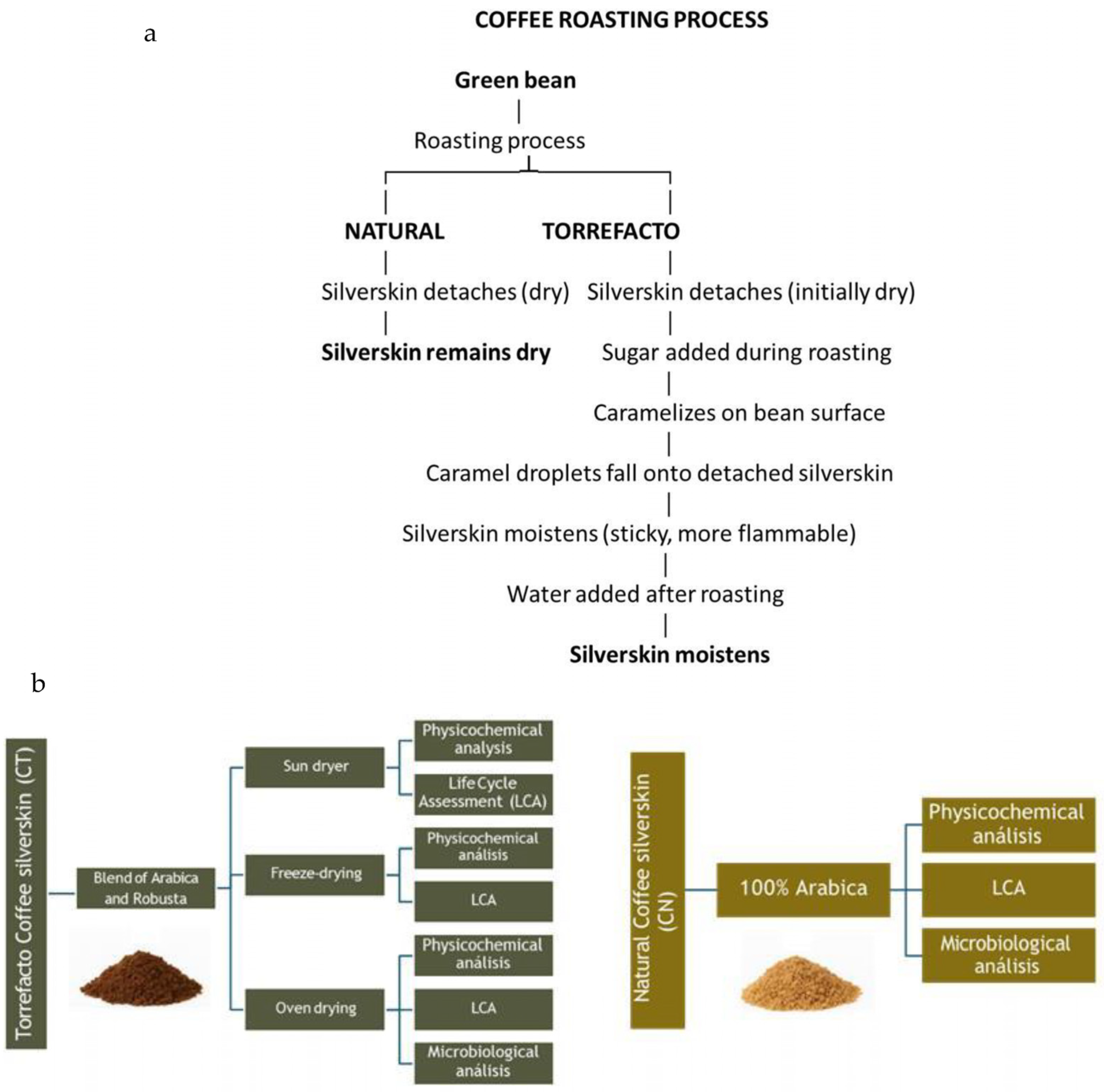 Figure 2. Silverskin from natural (CN) and torrefacto (CT) coffee: (a) flow during roasting, and (b) analyses performed.