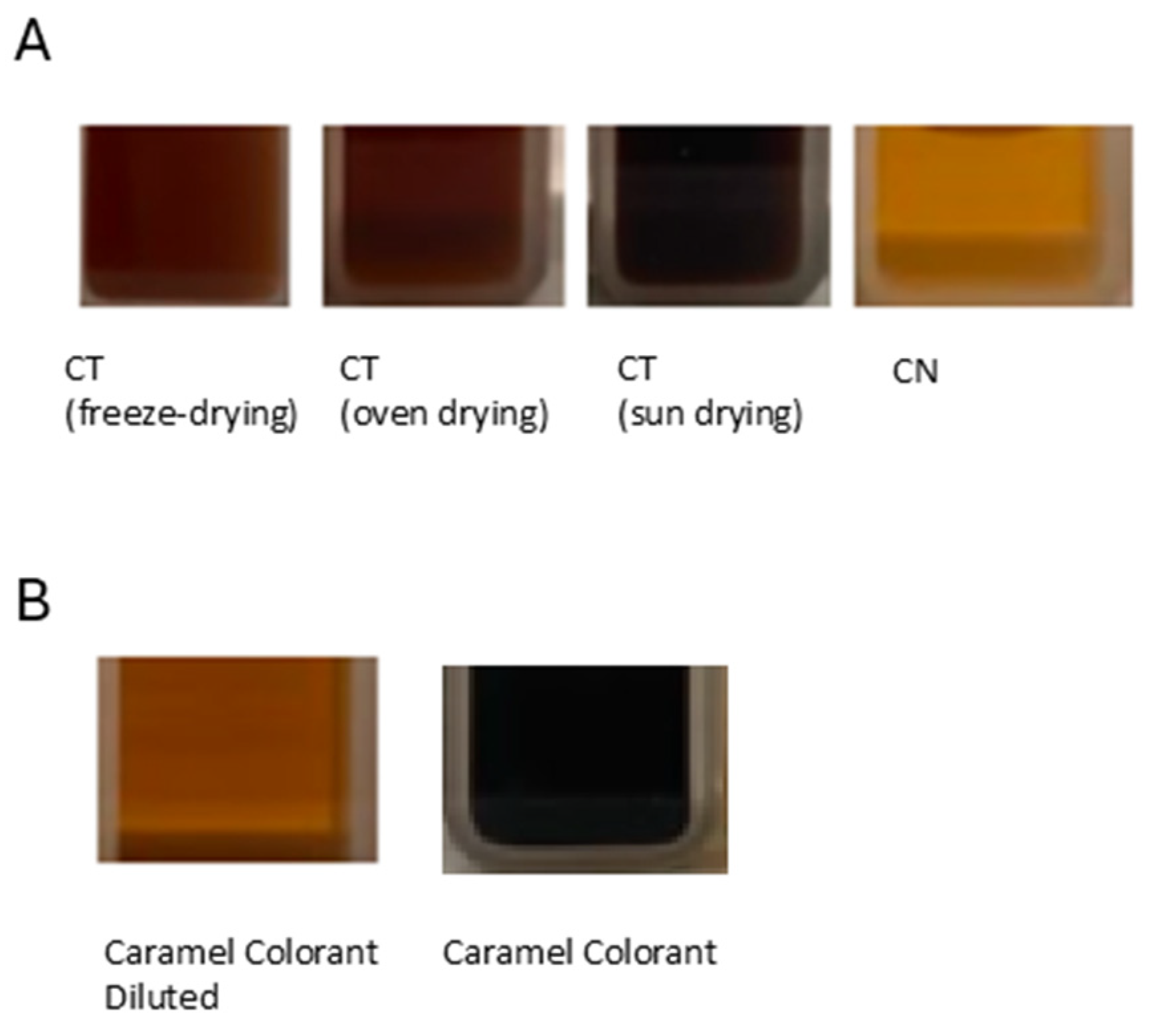 Figure 3. Color comparison of silverskin extract solutions (7 mg/mL) (A) and caramel colorant solution (0.7 mg/mL and 7 mg/mL, respectively) (B).