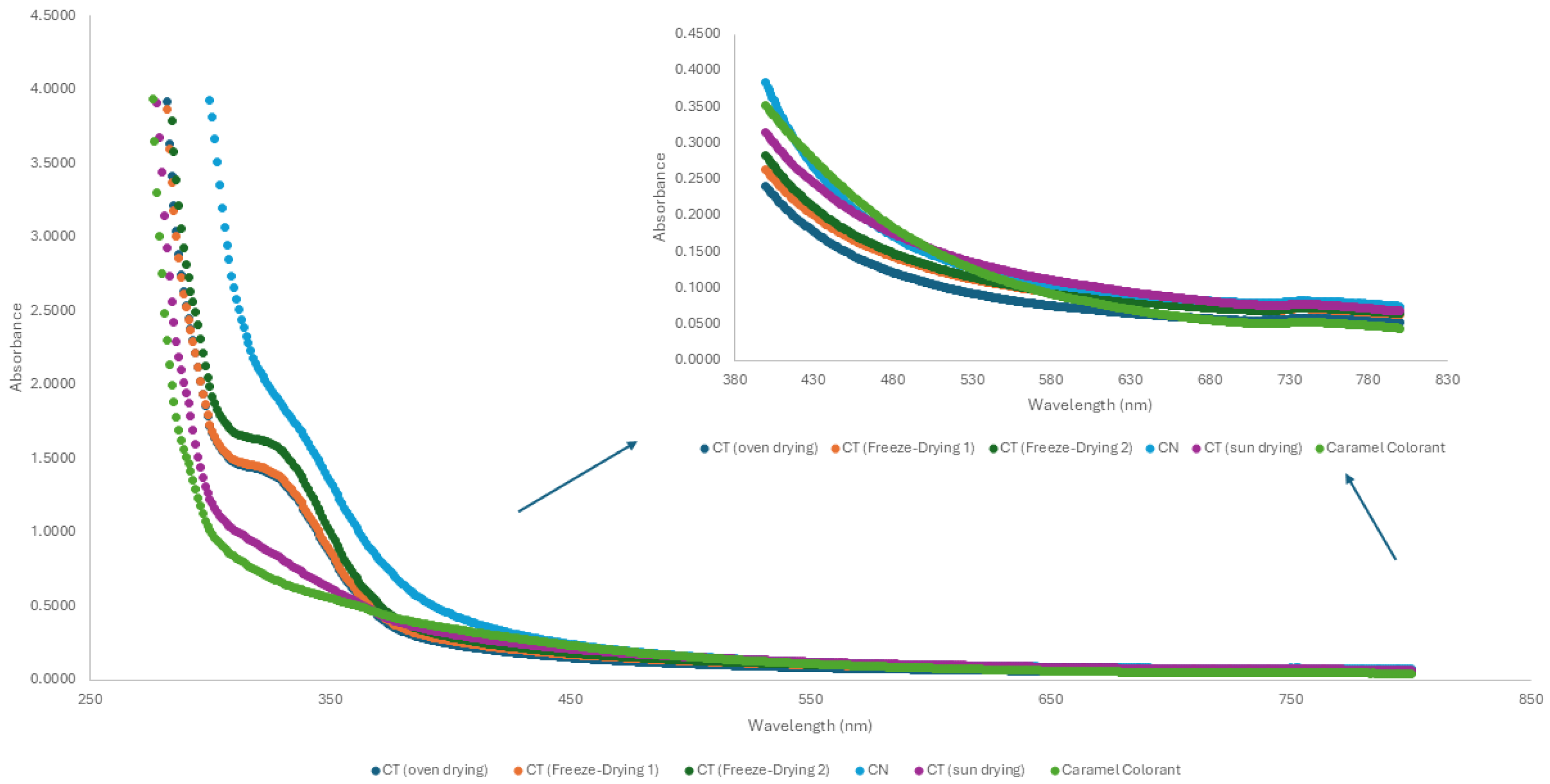Figure 4. UV-Vis spectra of coffee silverskin extracts and commercial caramel colorant.