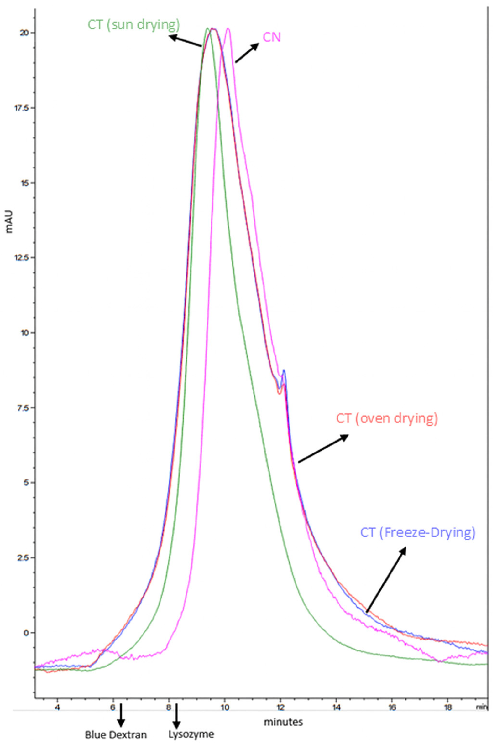 Further support comes from the molecular weight distribution profiles shown in Figure 5. While all profiles are similar, CT (sun) and CN display narrower peak ranges, which suggests lower molecular diversity. Based on retention times, CT (sun) appears to contain higher molecular weight melanoidins than CN, which is consistent with the ultracentrifugation results and the observed darker color in CT (sun). Similarly, the profiles of CT (freeze-dried) and CT (oven-dried) are closely aligned, which matches the similar intermediate coloration of their solutions between CT (sun) and CN. The presence of a higher content of high-molecular-weight melanoidins is particularly beneficial, not only for enhancing color but also for their potential bioactive properties, as previously discussed.
