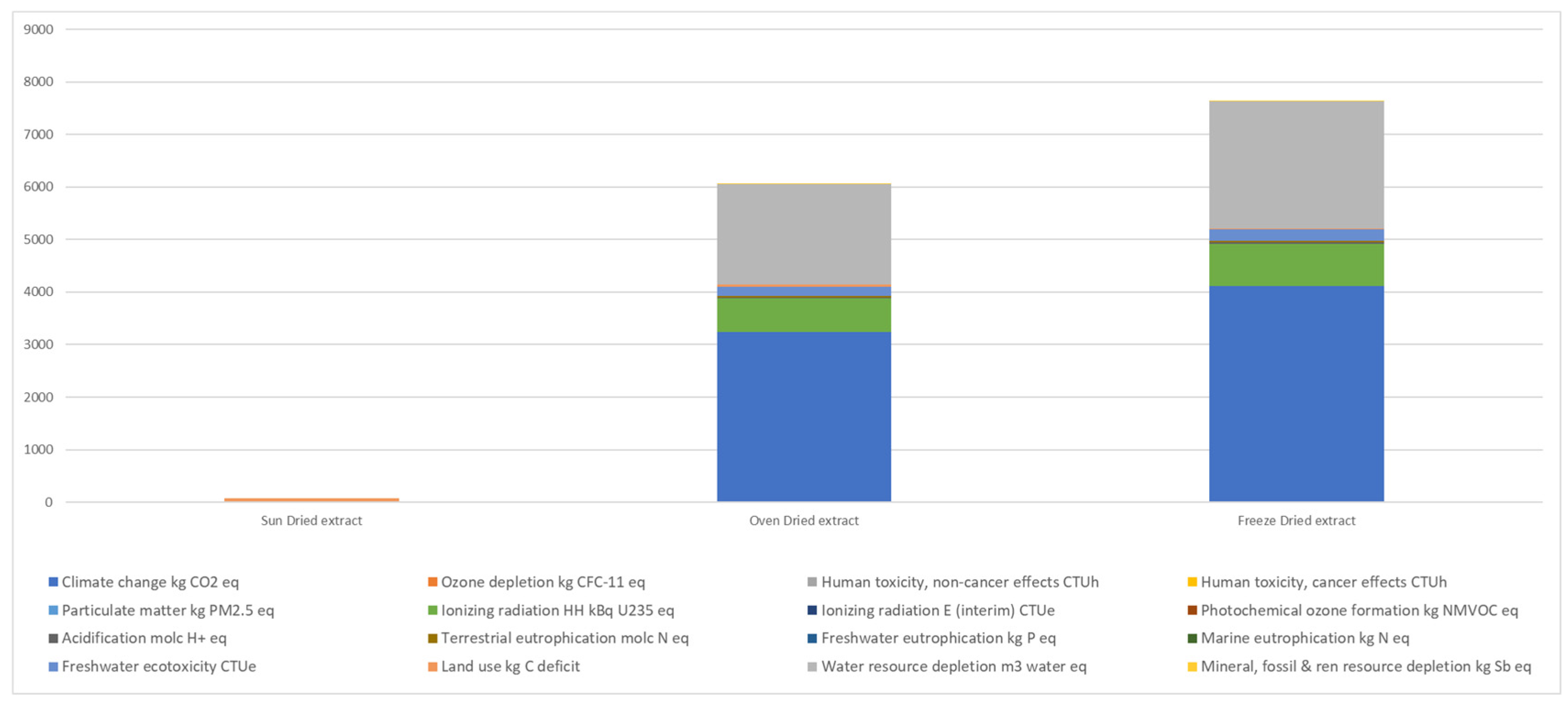 Figure 6. LCA comparison of environmental impact categories for the three drying methods per 100 g of dried extract, assessed using the ILCD 2011 Midpoint+ method.